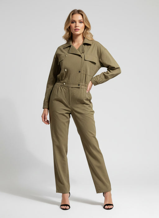 Omuzları apolet detaylı, lastikli bel, cepli, gömlek yaka, uzun kollu, fermuar kapamalı, yeşil Nazlı Ceren tulum%100 Pamukludur