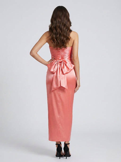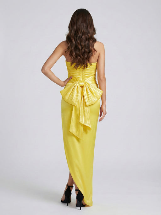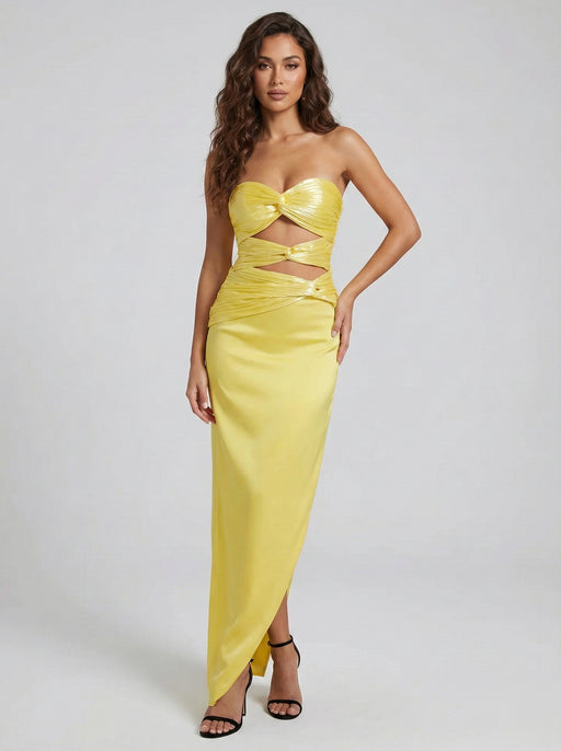 %100 Polyester. Ön detaylı, straplez model, yırtmaçlı elbise. İp çekmeleri vardır.