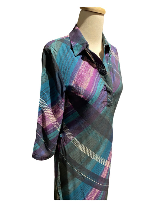 %100 Viskon. Çıtçıt kapama detaylı, mor ve yeşil desenli elbise.