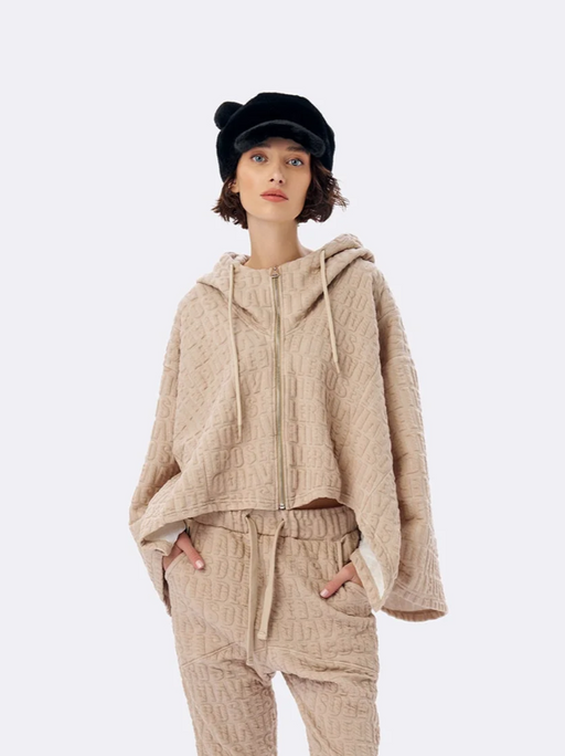 Siyah, pembe ve beyaz renklerinde, kapüşonlu Manço. Havlu kumaştır.