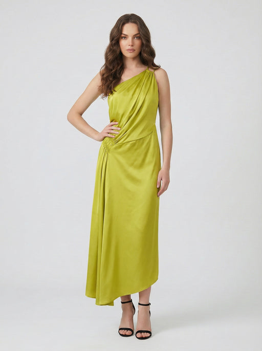 Tek omuz askılı, fermuar kapamalı, yan detaylı, fıstık yeşili elbise.