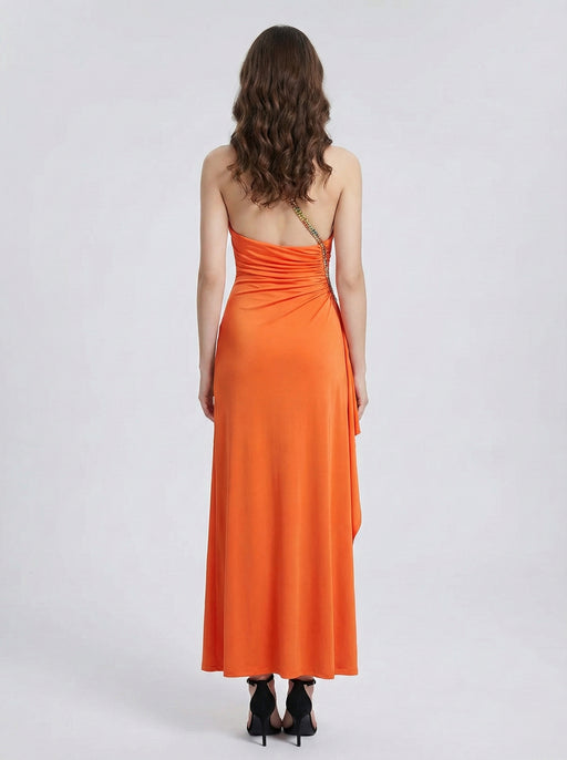 Otriş detaylı, askılı, sırt dekolteli elbise.
