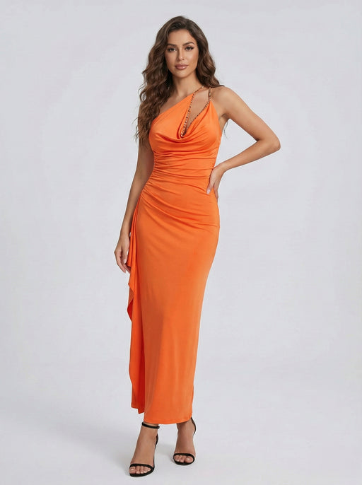 Renkli taş askılı, derin yırtmaç detaylı elbise.