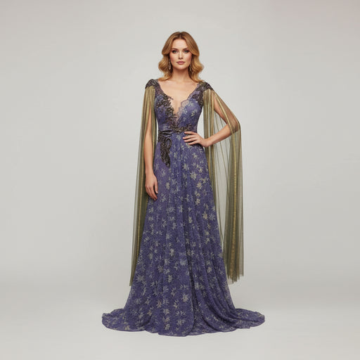 S beden Pul ve taş işlemeli Kolları pileli ve uzun Çiçek desenli uzun abiye