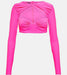 Alex Perry'nin bu kısa üstü, vücuda oturan bir kesim için jarse kumaştan üretilmiştir. Bükümlü yakası, önü açıkta bırakan kesimi ve büzgülerle tamamlanmış kalp şeklinde göğüs kısmı bulunmaktadır.