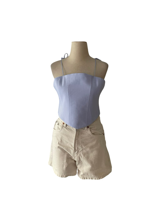 %100 Pamuk, lacivert-beyaz çizgili, askılı bluz.