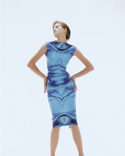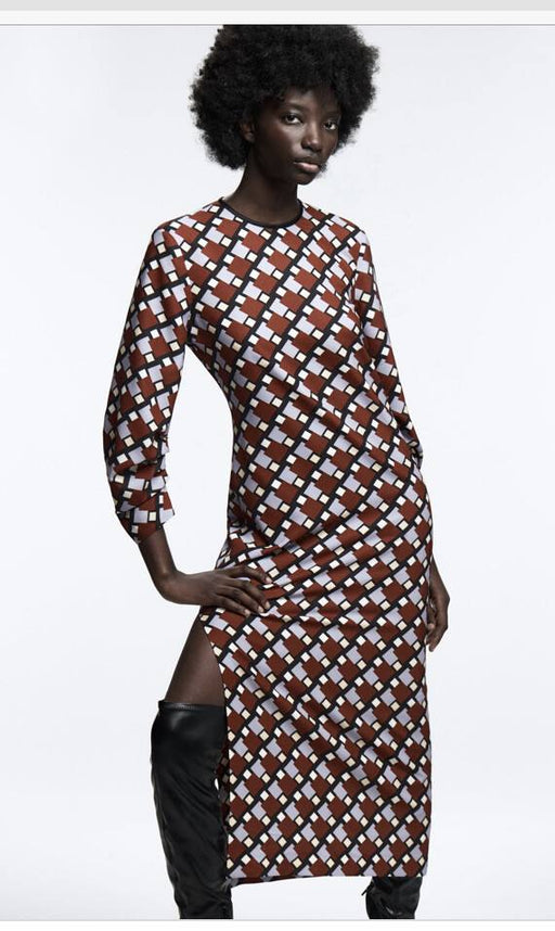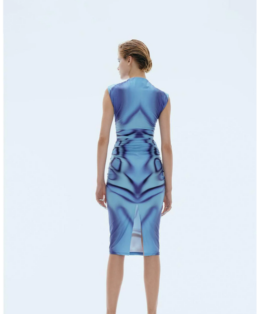 Yüksek streç kumaşBeli büzgülü tasarımMidi boyArkada yırtmaç detayıKumaş:%95 Pes, %5 Ea