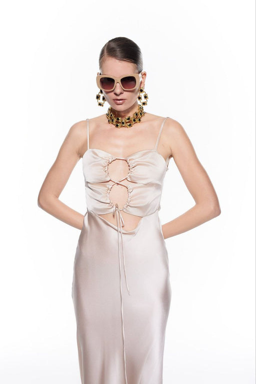Zoe İpek Elbise, derin göğüs dekoltesi ve ayarlanabilir askılarıyla şık ve zarif bir silüet sunar, kişiye özel bir uyum sağlar.Bu elbise, rahatlık ...