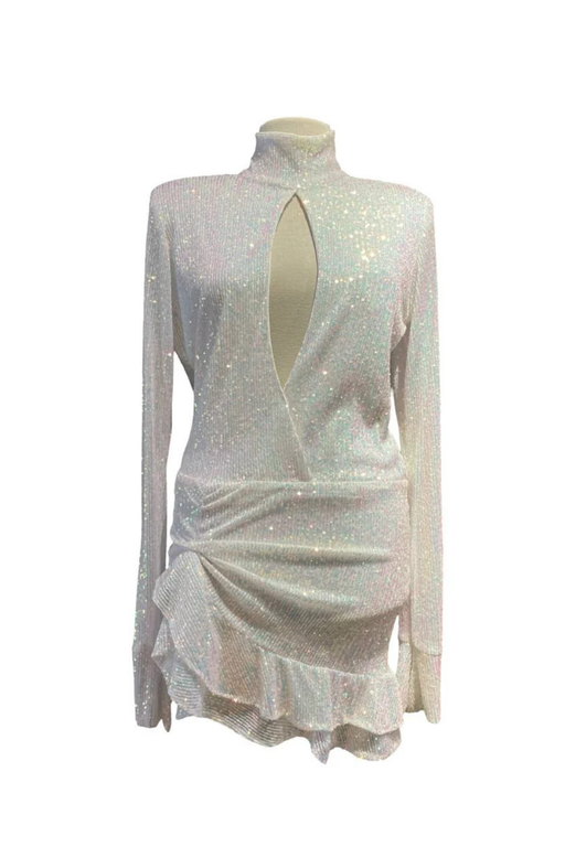 Blazer görünümlü, kırlangıç yaka, kısa elbise. Elbisenin ana kumaşı %100 ipek organza ile kaplanmıştır.
