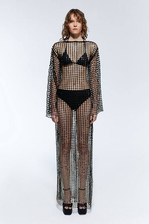 •tek beden •xs-s-m bedenlerine uygundur •uzun elbise • uzun kollu •siyah file kumaş üzerine , gold pul işlemeli elbise •arka yır...
