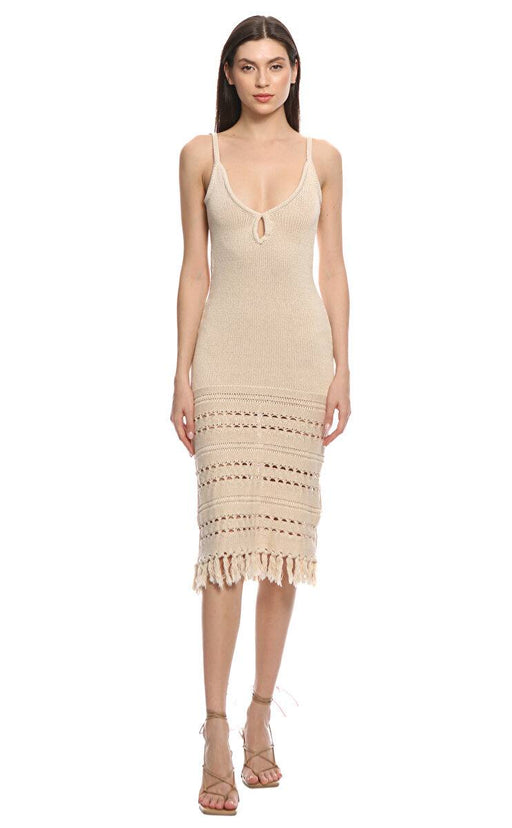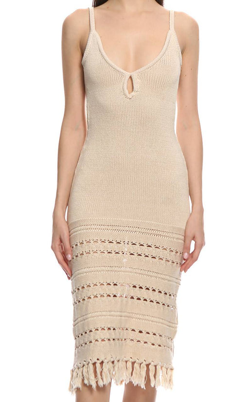V yakalı, askılı kollu, örgü desenli, göğüs küçük pencere detaylı, eteği püskül detaylı, bej Honest The Label elbis %100 Organik Pamuk