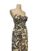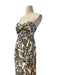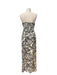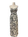 Beyaz pamuklu kumaş üzerine siyah çiçek desenleri olan, straplez kadın uzun elbise.