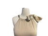 Kolsuz, boynunda saten kumaş detayı ile bağlamalı kadın bluz.