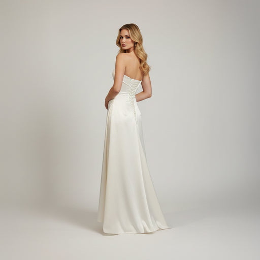 Sırt dekolteli, göğüs kısmı taş işlemeli elbise. İp çekmeleri vardır.