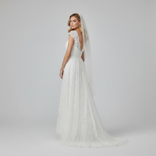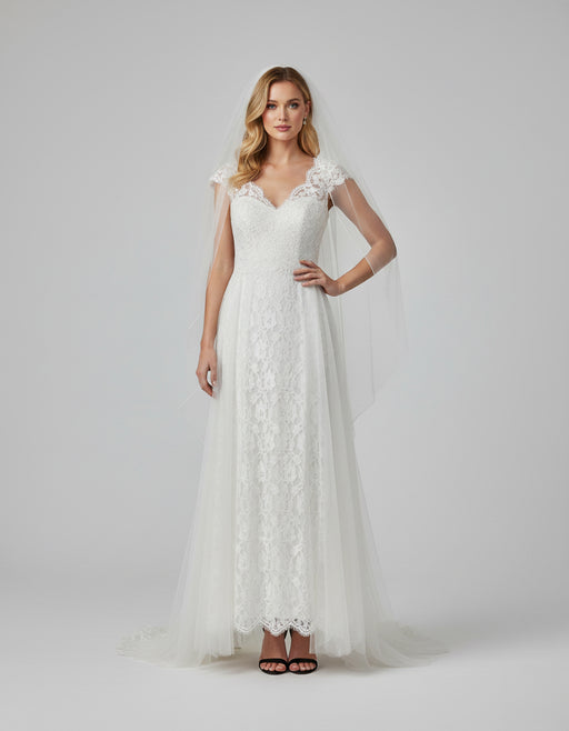 Omuzları tül ve inci işlemeli gelinlik Duvak ile birlikte satılmaktadır