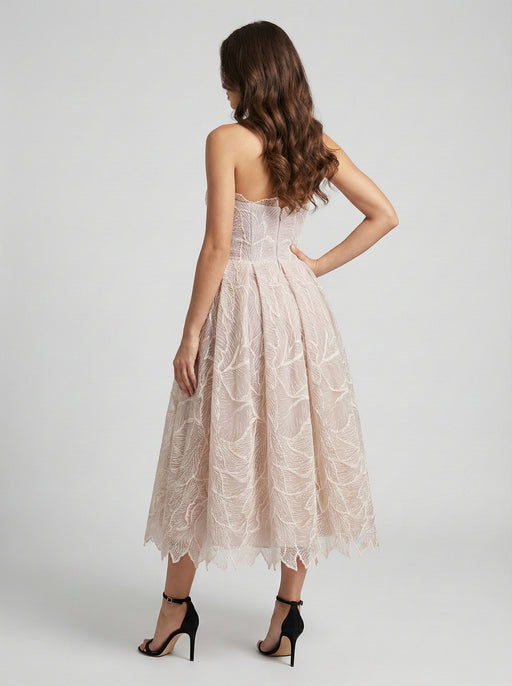 %100 Polyester. Göğüs kulplu, dantel detaylı, sırtı fermuar kapamalı elbise.
