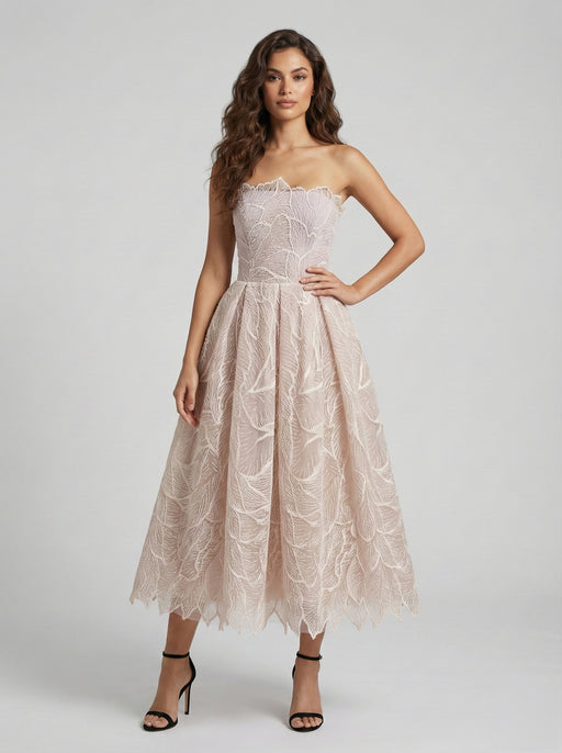 %100 Polyester. Ön detaylı, straplez model, yırtmaçlı elbise. İp çekmeleri vardır.