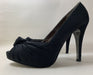 Önü açık, parlak kumaş detaylı, topuklu ayakkabı.