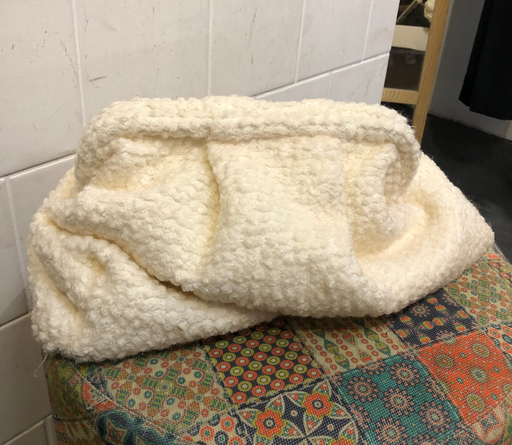 Fermuar kapamalı, çift gözlü, pofuduk kumaş çanta. Tutma yerinin içerisindeki parça hafif dışarı çıkmıştır. Yaptırılabilir.