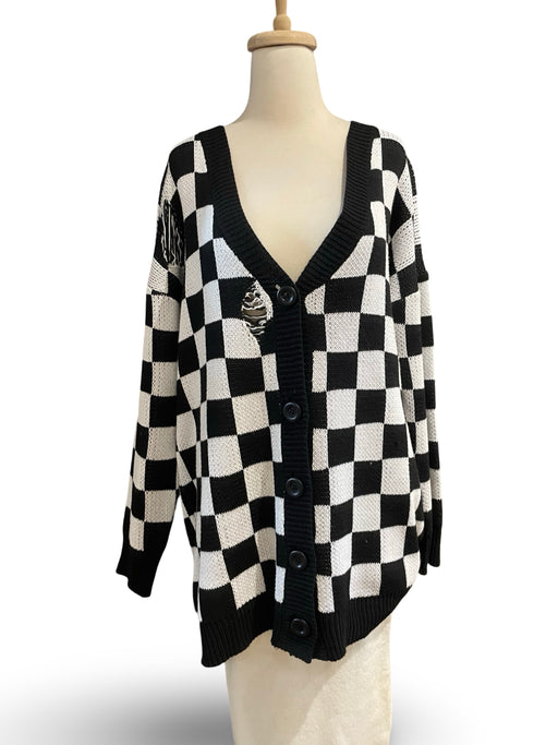 %100 Akrilik. Siyah-Beyaz damalı, sökük detaylı, oversize kalıp hırka.