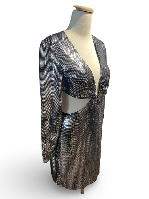 Derin göğüs ve yan dekolteli, payetli elbise.